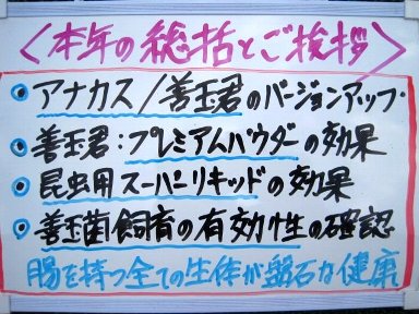 | < 12月第3週の飼育状況:本年の善玉菌飼育の総括/新春プレゼント企画/ 無選別稚魚販売予約のお知らせ! (12/16) > |