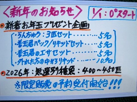| ・新春:元旦からの、(1/1:0時〜スタート) ◎「新春:お年玉プレゼント企画」(魚セット/善玉君パック,リキッド/善玉君の餌) ◎「2026年:無選別稚魚:400〜450匹:限定販売の予約受付開始」 ・本年も大変お世話になりました。引き続き、来年もご声援方よろしくお願いいたします。 |