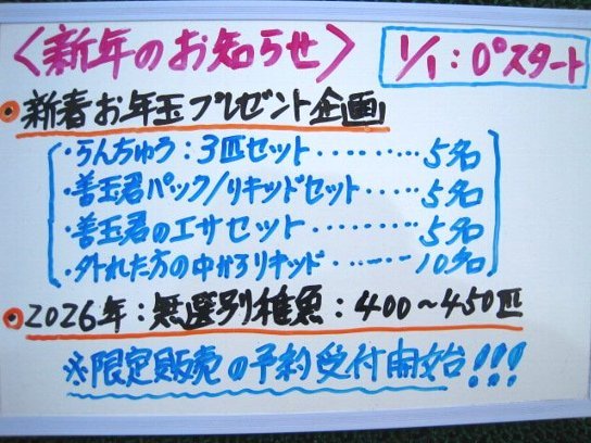 | 2026年:無選別稚魚:予約受付スタート! | |
