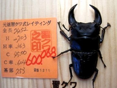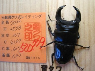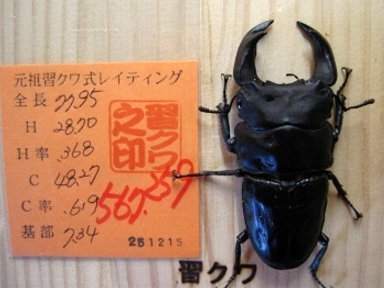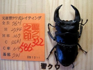 | ・全国のトップブリーダさんの凄い作出個体と比較させて頂いてもトップクラスのスコアーをいただけて大変嬉しいです。 ・習志野クワガタ(習クワ)さんの「習クワ式レーティング(数値評価)」にて評価して頂きました。(12/15) |