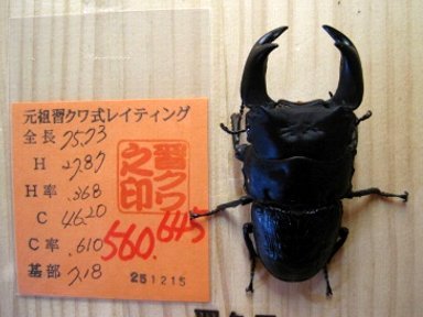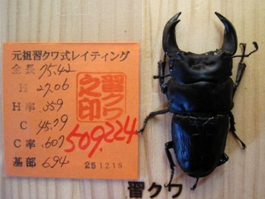 | *「習クワ式レーティング」は、個体の形状を数値化して客観的(平等評価)で正確に評価できるものです。 私は、このレーティングの素晴らしに共感しています。 (大きさだけの追究ではなくて、フォルム:形状、体形前方に武器を備えた個体を評価) 詳細は、◎習クワブログ:https://ameblo.jp/nara-kuwa/entry-12950180787.html と ◎習クワHP:https://www.narakuwa.jp/ を参照願います。 (トップブリーダーの皆さんが、レイティング:500点以上を目指しています) *このレイティングの競技参加資格は、自身でブリードしている方々です。 (私は:レイティングして頂いておりますが競技参加はしていません) |
