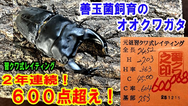 | ●昨年:2025年:習クワ式レイティングで、 善玉菌:アナカス/善玉君:昆虫用スーパーリキッド飼育の国産オオクワガタが、 昨年に引き続き高い、2年連続で評価点:600点超えを達成しました。 「極太系」の結果をご紹介いたします。 詳細は、◎習クワブログ:https://ameblo.jp/nara-kuwa/entry-12950180787.html で解説されています。 ●個体は、全て(知人のブリーダに善玉菌の提供とバクテリア飼育をアドバイスをし)善玉菌飼育です。 3年連続で、素晴らしい個体が誕生しました。600点超え:歴代最高レベルの得点です。 ●種親の飼育/交配/幼虫飼育:菌糸瓶;広葉樹マットにアナカスで加水し:幼虫〜さなぎ〜羽化〜成虫へと飼育しました。 ●羽化した成虫は善玉君:昆虫用スーパーリキッドで飼育しました。善玉菌で飼育容器内に自然界を実現しました。 *詳細は、下記のYouTube動画をご覧ください。 |