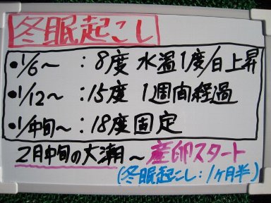 | < 1月第3週の飼育状況:冬眠起こし:1週間経過の状況!種魚達の体調は万全! (1/12〜13) > |