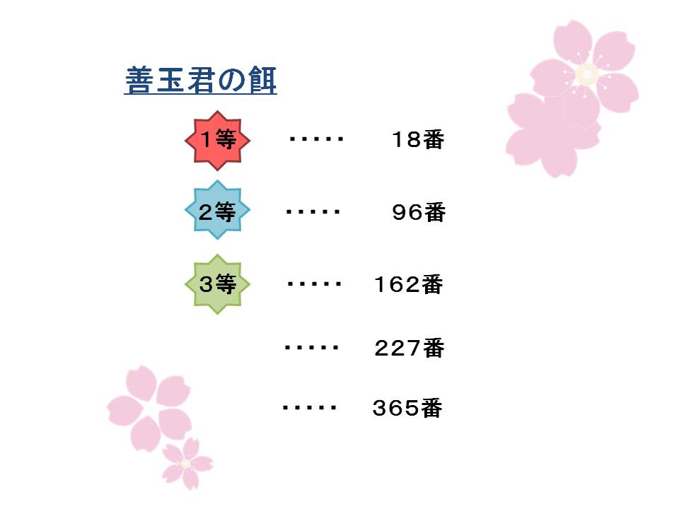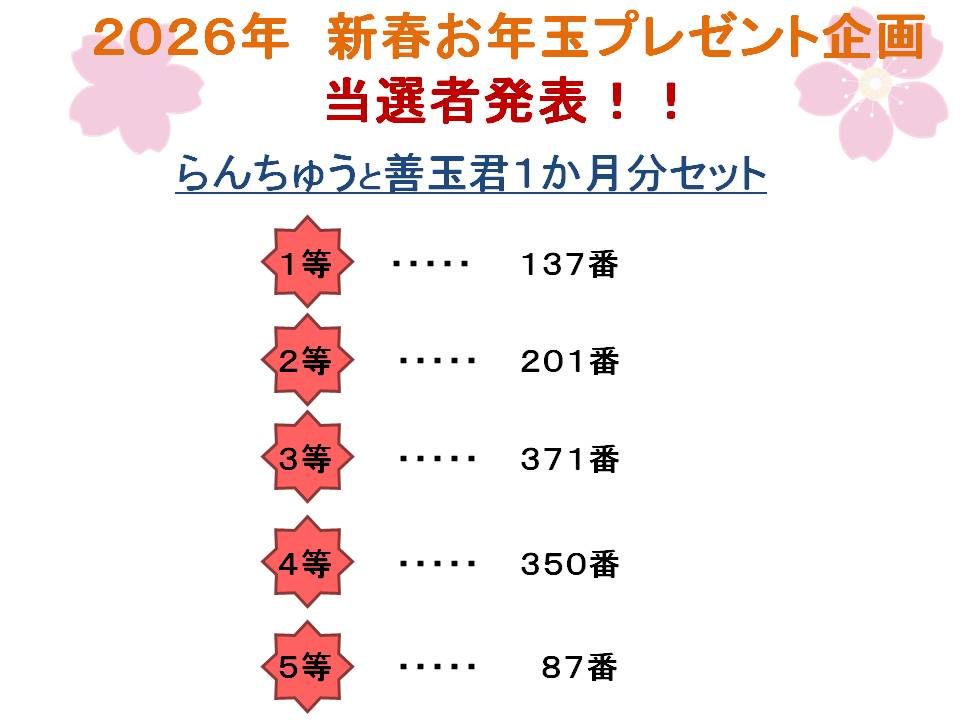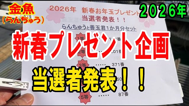 | ・大変お待たせいたしました。 応募総数:420名を超える!ご応募ありがとうございました。 「新春お年玉プレゼント企画」当選者の発表です。 *下記のYouTube動画で、ご確認ください。 |