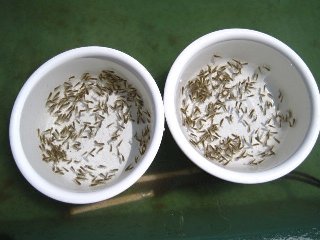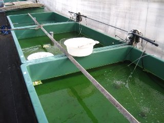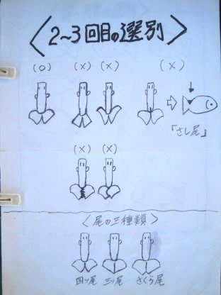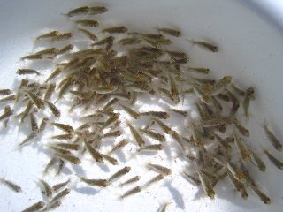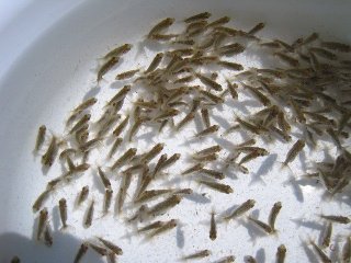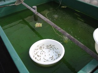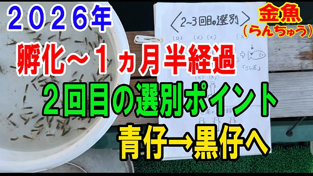 | ・2月下旬孵化の稚魚達は、孵化後:1か月半を経過してきました。 ・青仔⇒黒仔の大きさまで成長しています。 ・2回目の選別作業が続きます。 |