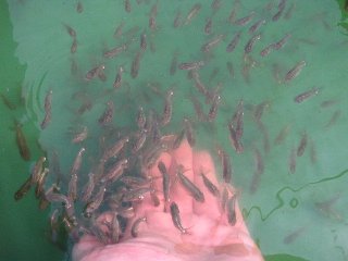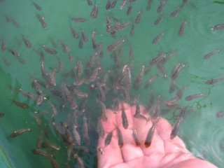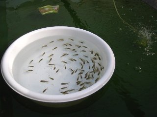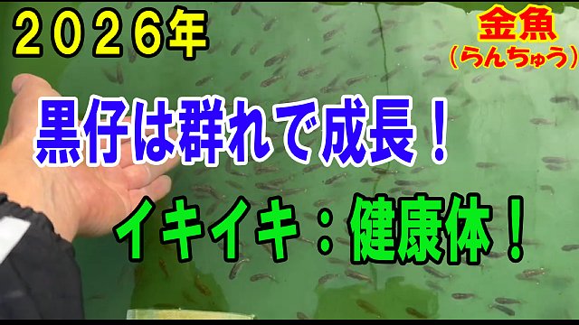 | ・黒仔まで成長しています。 エサが欲しく、稚魚達は手のひらによってきます。 ・稚魚達は群れで成長していきます。 ・黒仔が群れる様子は爽快です。この勢いが健康の証です。 |